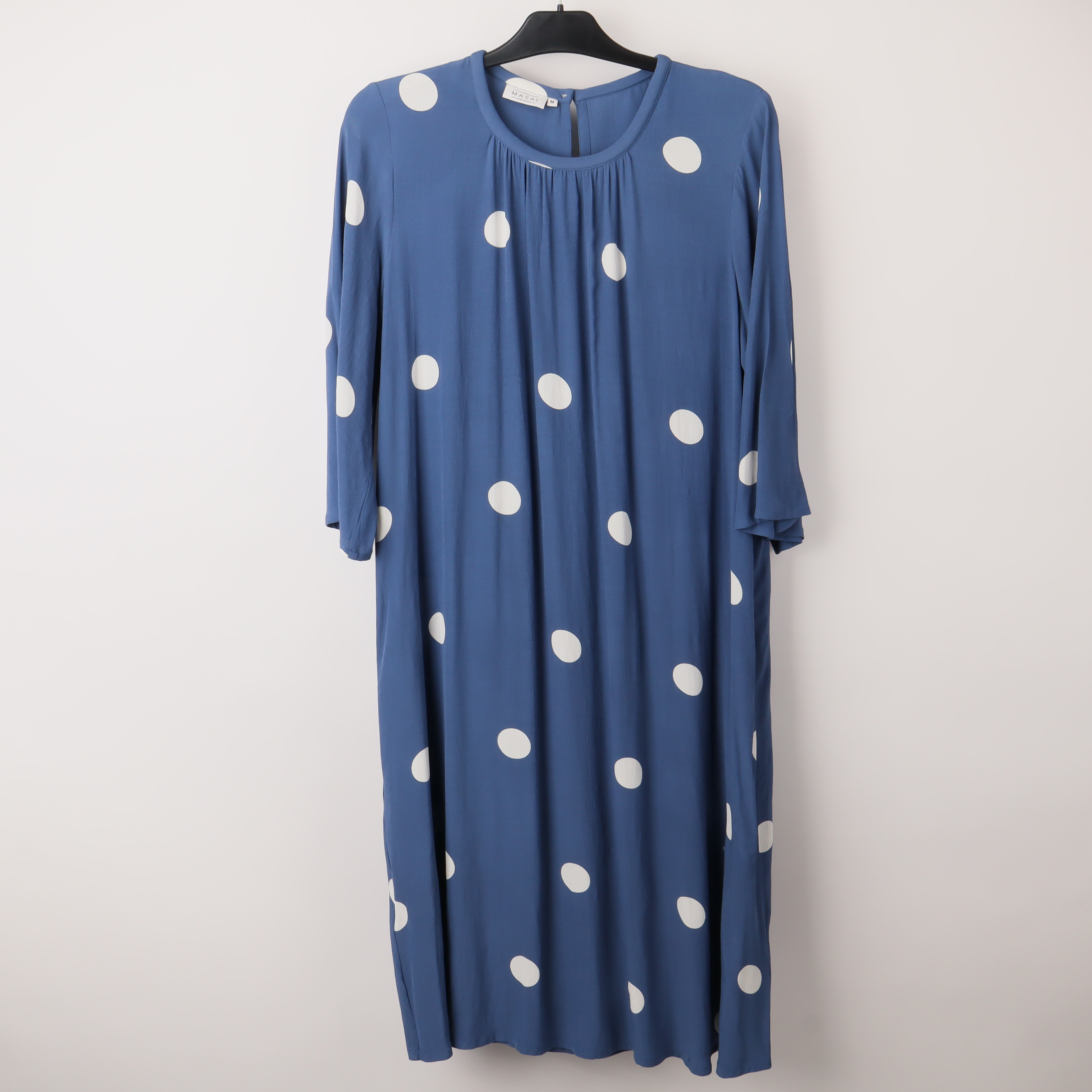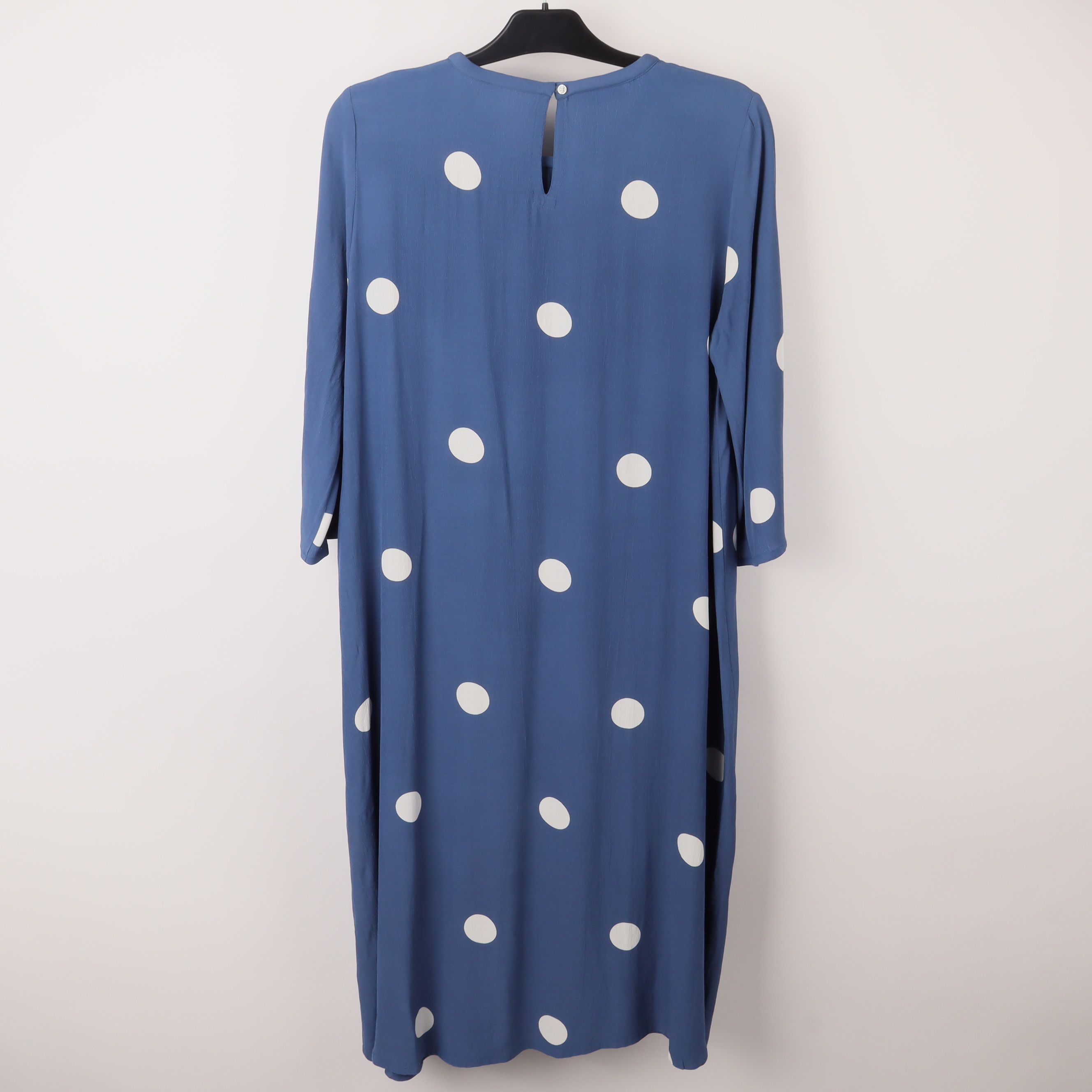 Denna stilrena blå klänning med vita prickar erbjuder både komfort och mode. Tillverkad av 100% viskos, ger materialet en lätt och luftig känsla, perfekt för varmare väder. Designen har en lös passform som smickrar många kroppstyper och ger en avslappnad silhuett. Trekvartsärmar och en rund halsringning kompletteras av en diskret knappstängning i nacken. Den prickiga designen tillför en lekfull men elegant touch, vilket gör den lämplig för både dagliga utflykter och sommarfester. Kombinera den med enkla sandaler för en chic vardagslook eller med klackar för mer formella tillfällen.
