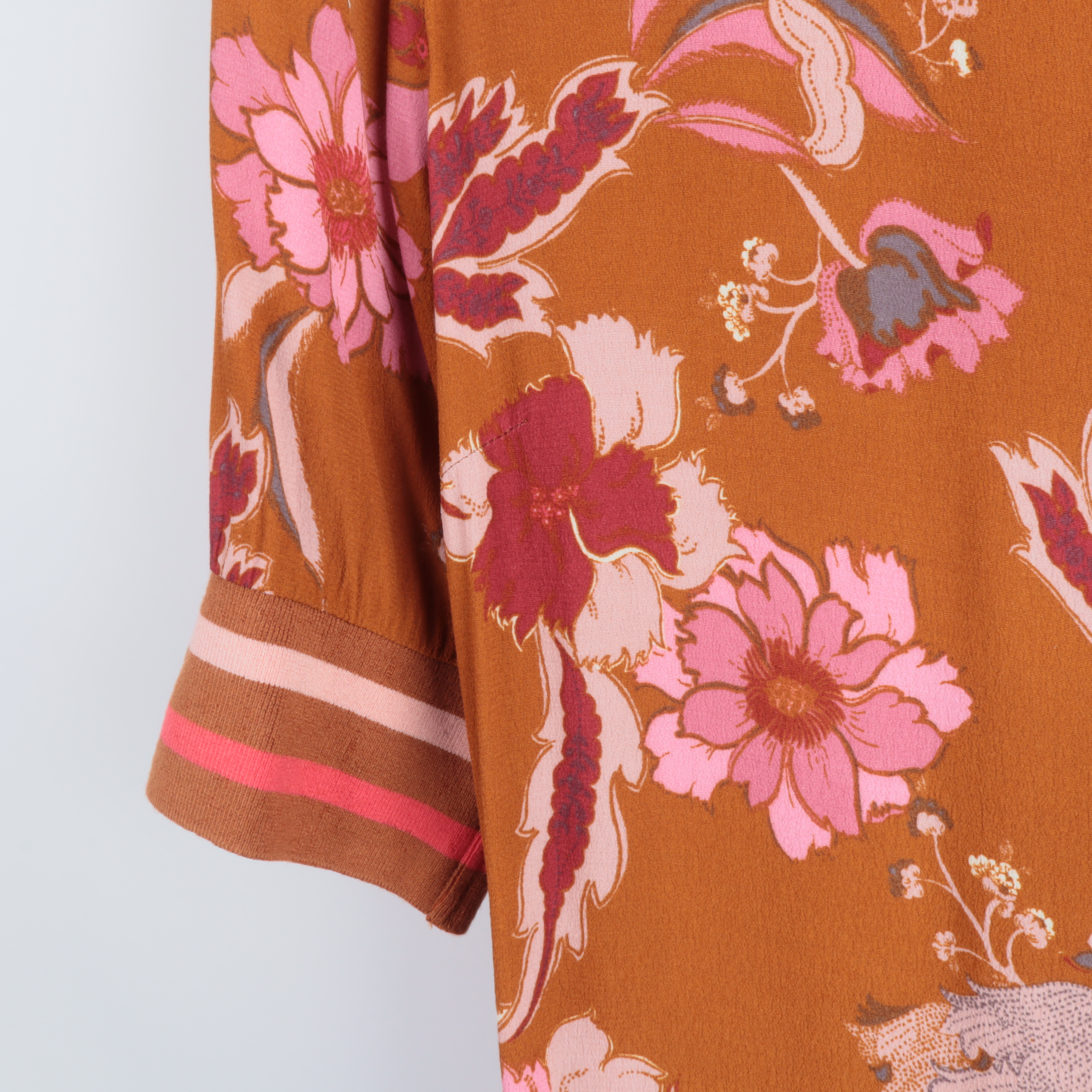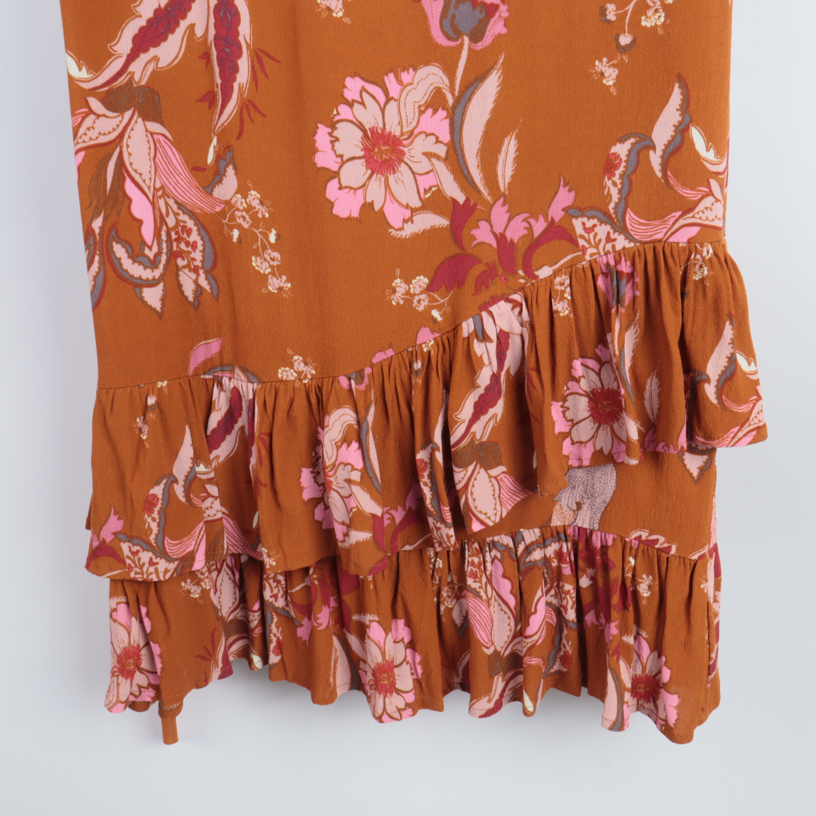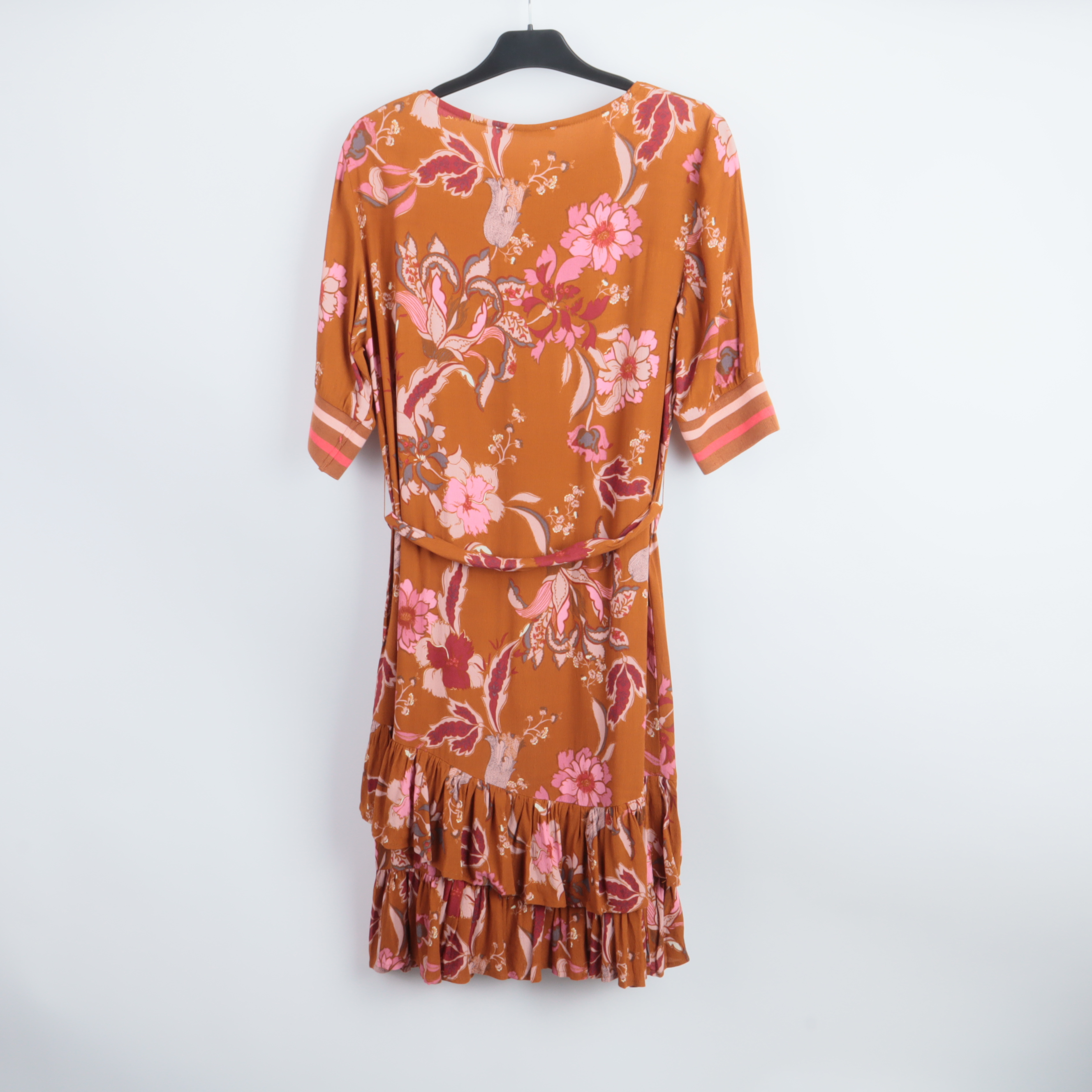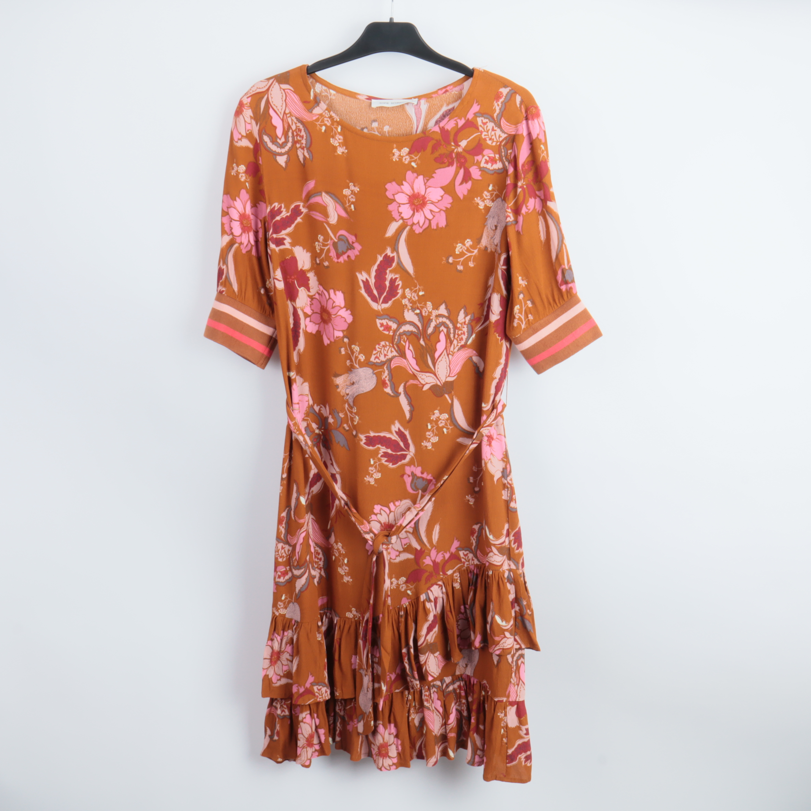 Klänning med vackert blommönster i kontrasterande nyanser. Tillverkad av 100% viskos för en mjuk och behaglig känsla. Unik design med volangdetaljer som ger en feminin touch. Perfekt för både formella och vardagliga tillfällen.