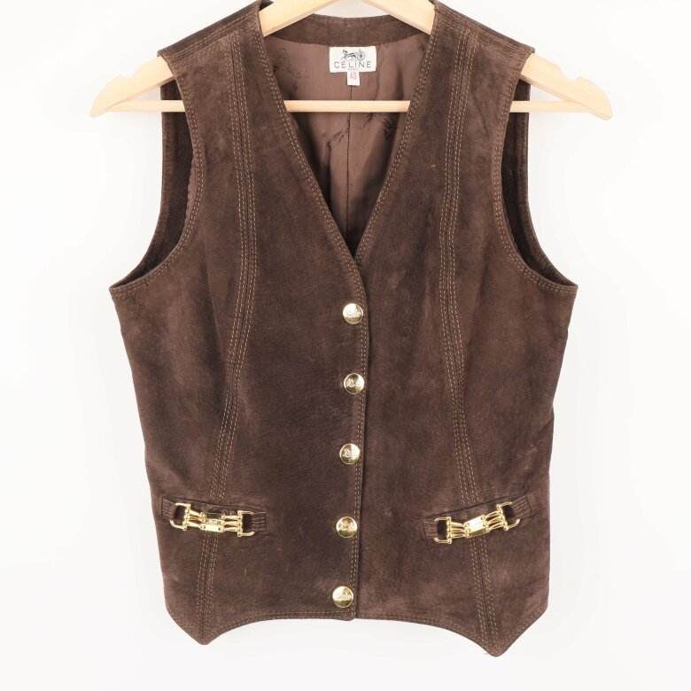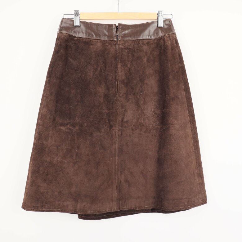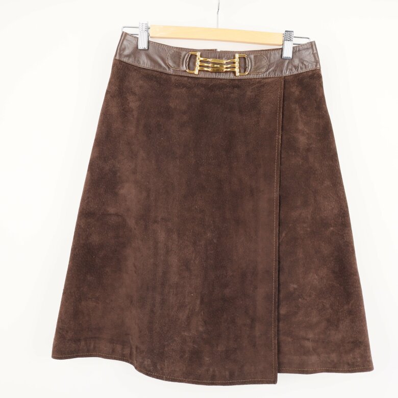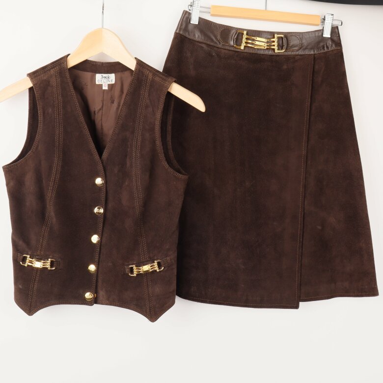 Elegant mockaset bestående av väst och kjol i brunt med gyllene detaljer. Väst med knappar framtill, och kjol med dekorativa spännen vid midjan. Passande för en stilfull och klassisk look.