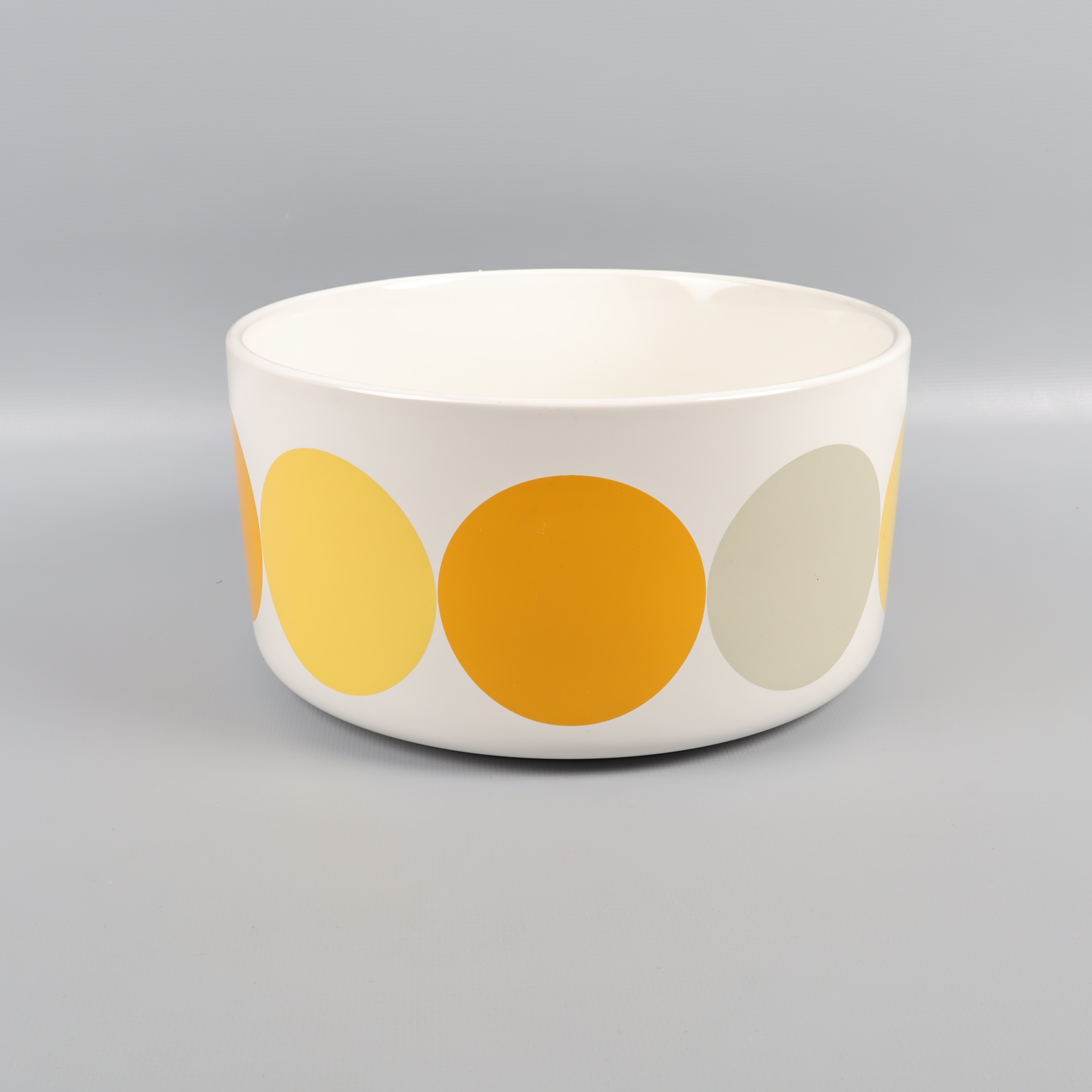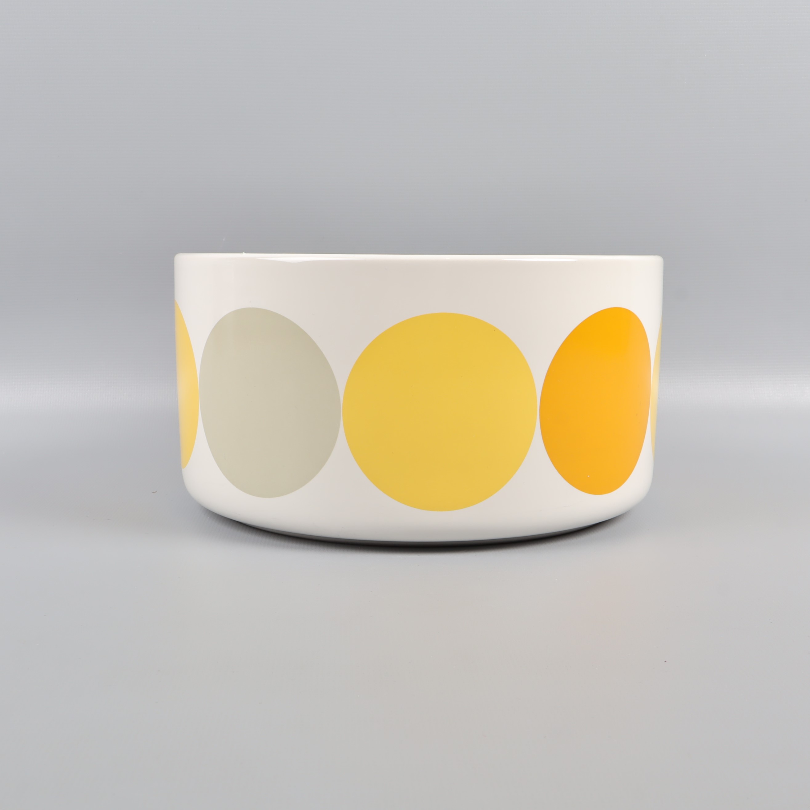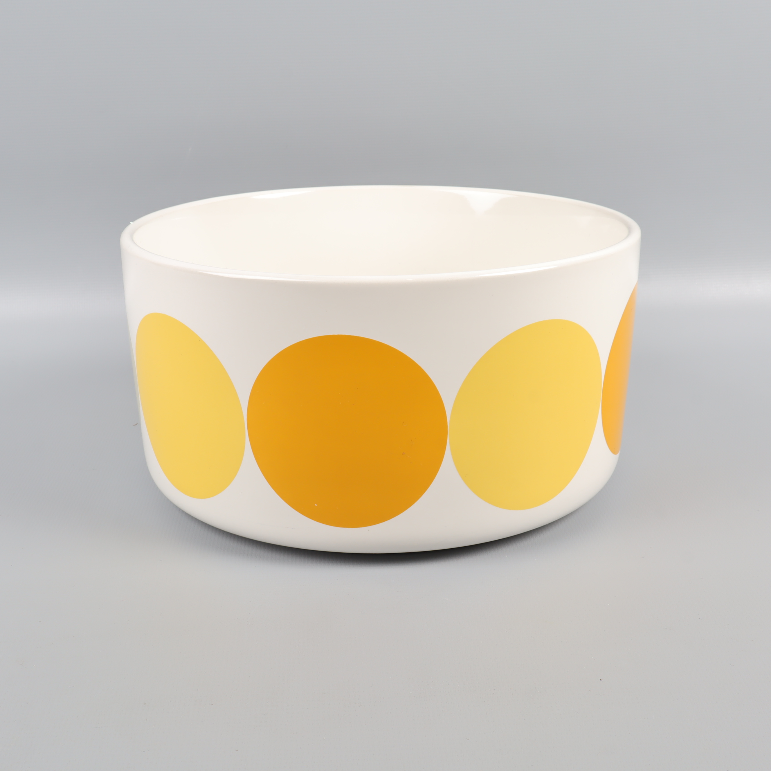 Denna eleganta vita skål är dekorerad med färgglada cirklar i gult och orange, vilket ger den både en modern och lekfull känsla. Skålen är perfekt för servering av sallader, frukt eller snacks och kan enkelt bli ett vackert tillskott på ditt bord. Den är idealisk för dagligt bruk eller speciella tillfällen. Skålens generösa storlek gör den praktisk för olika matuppgifter.