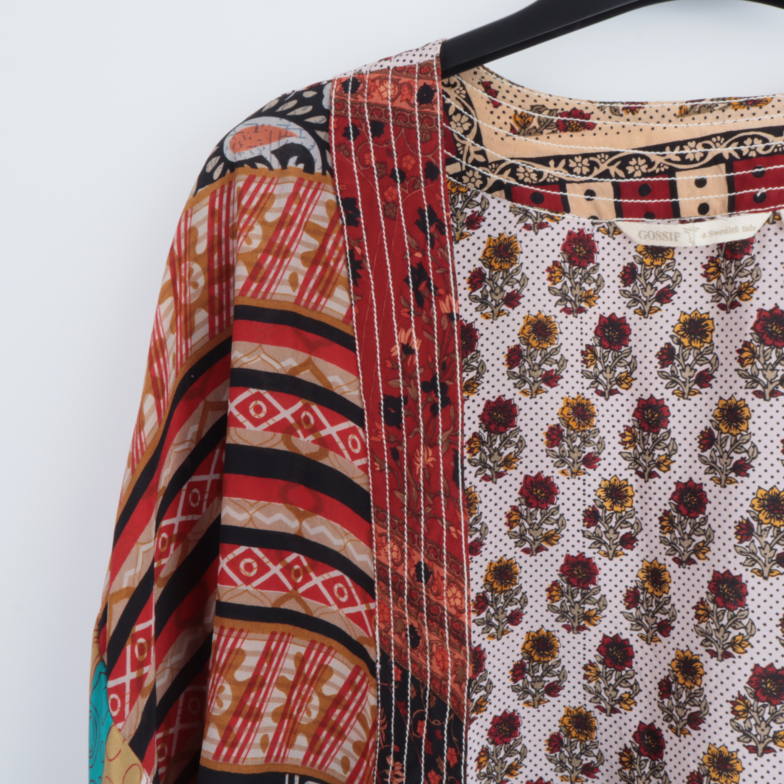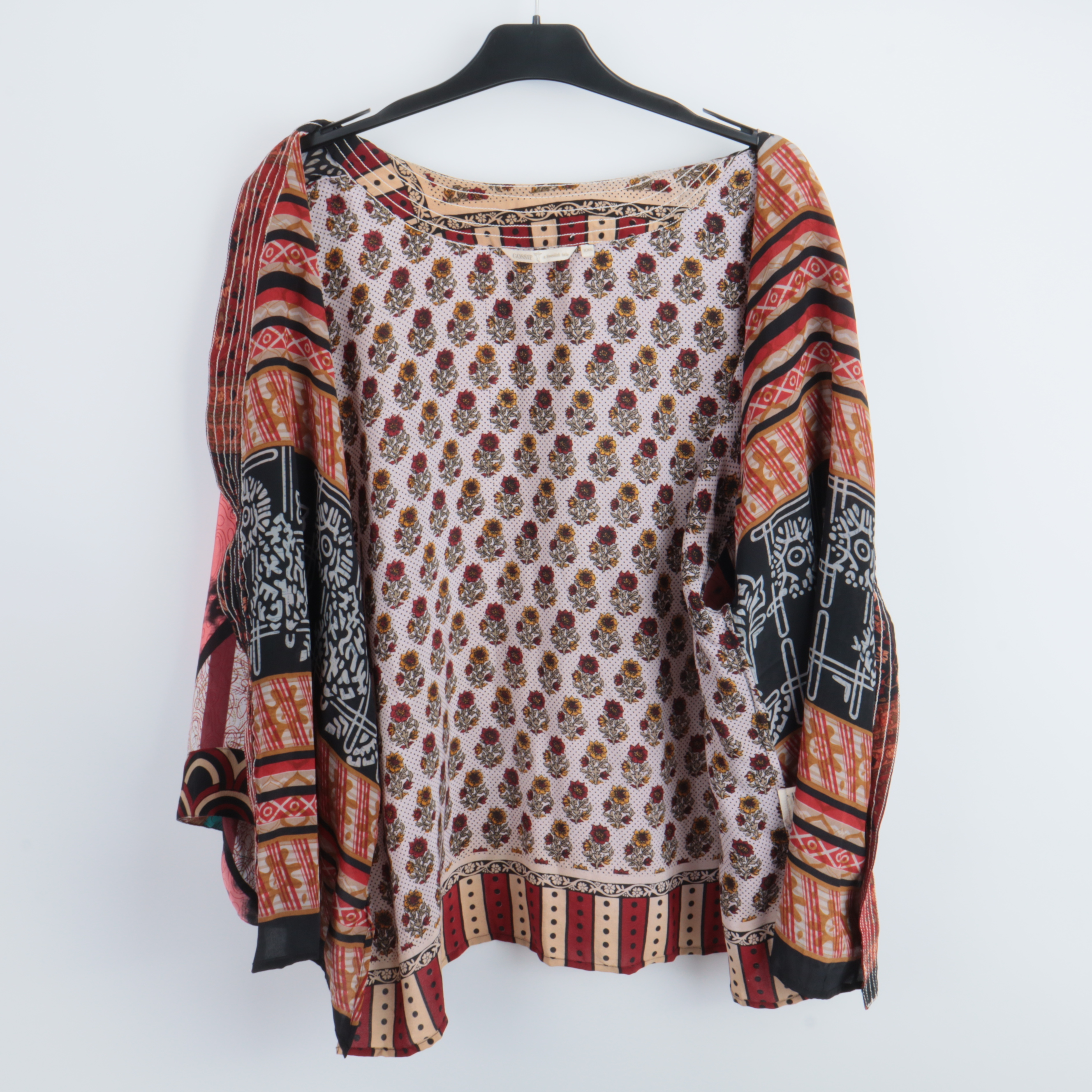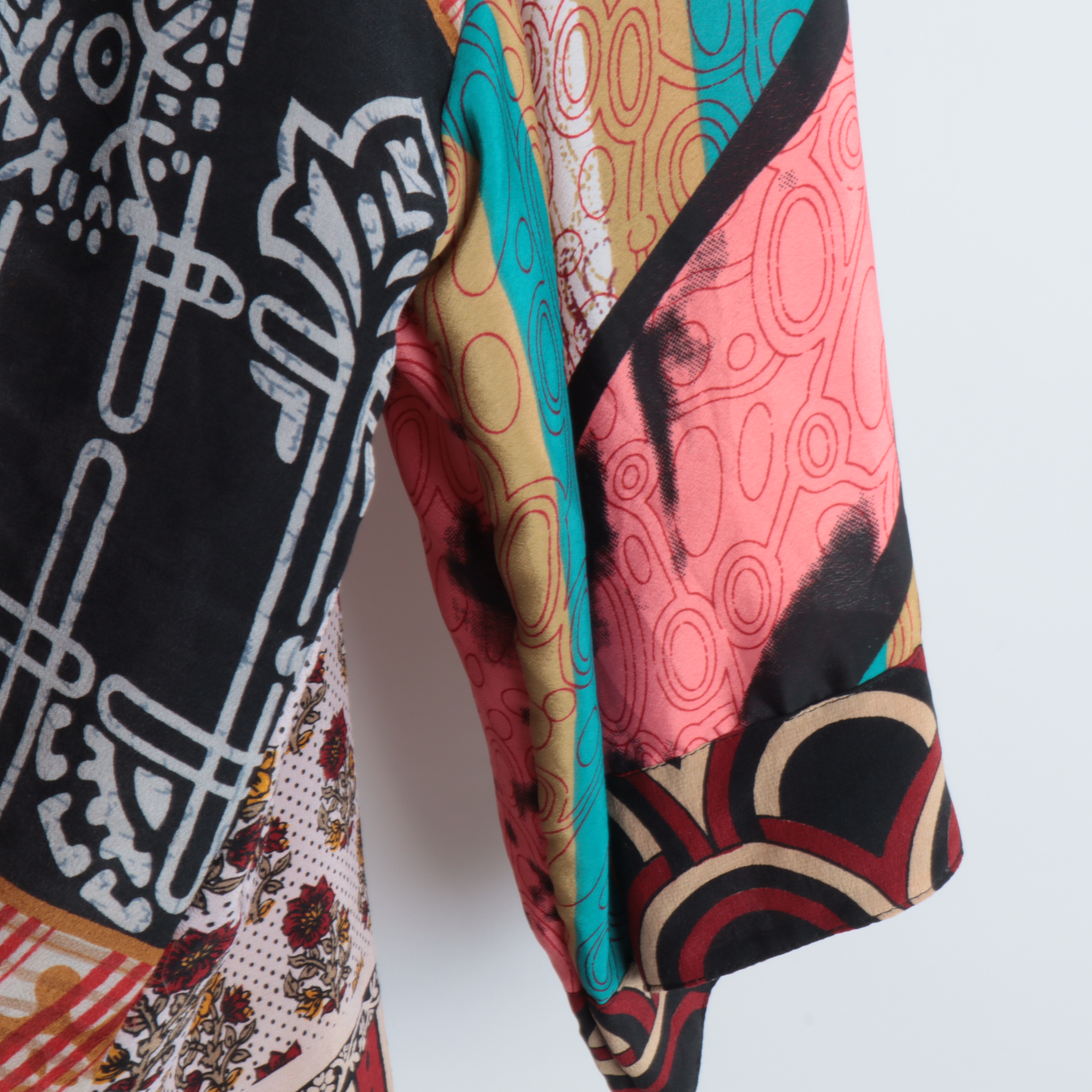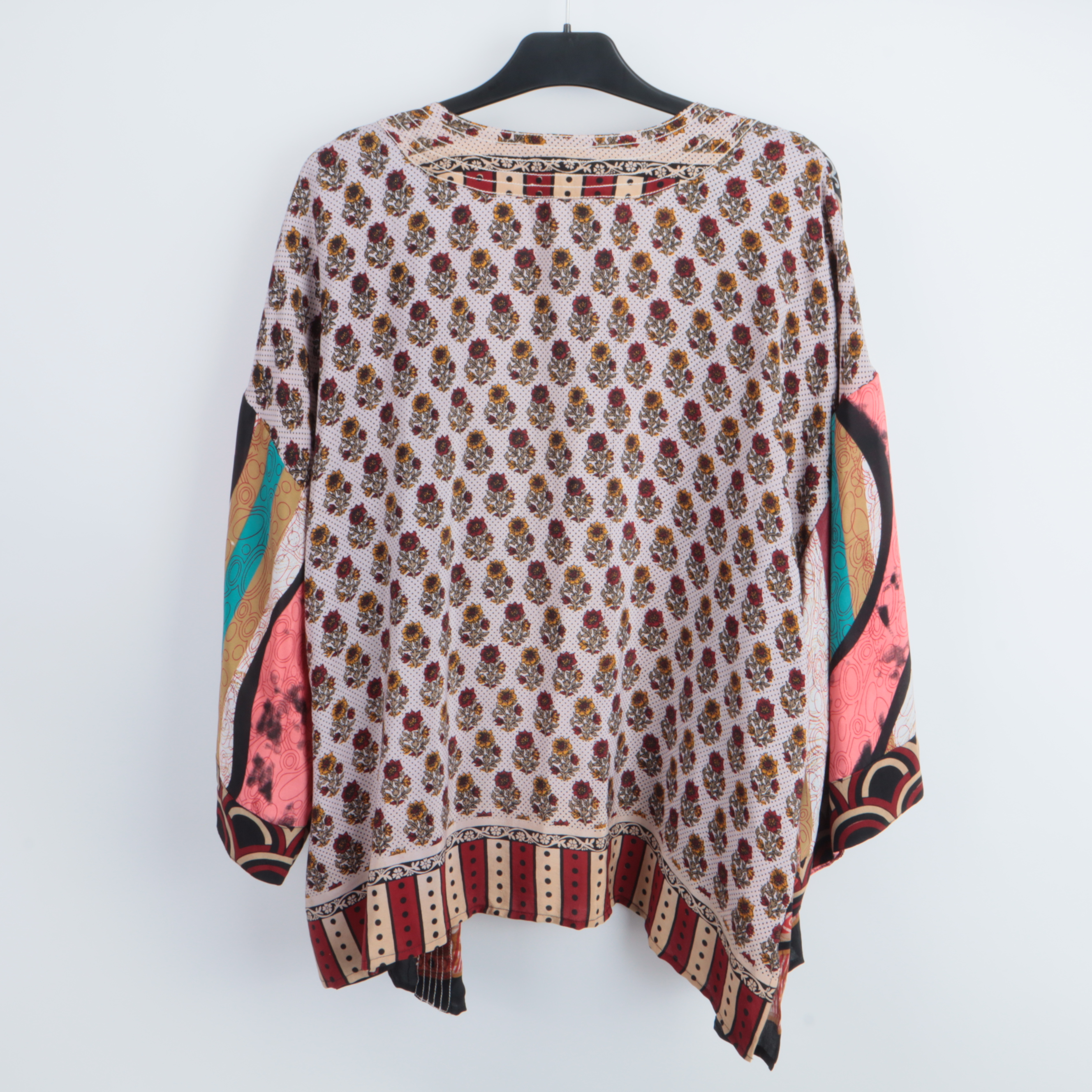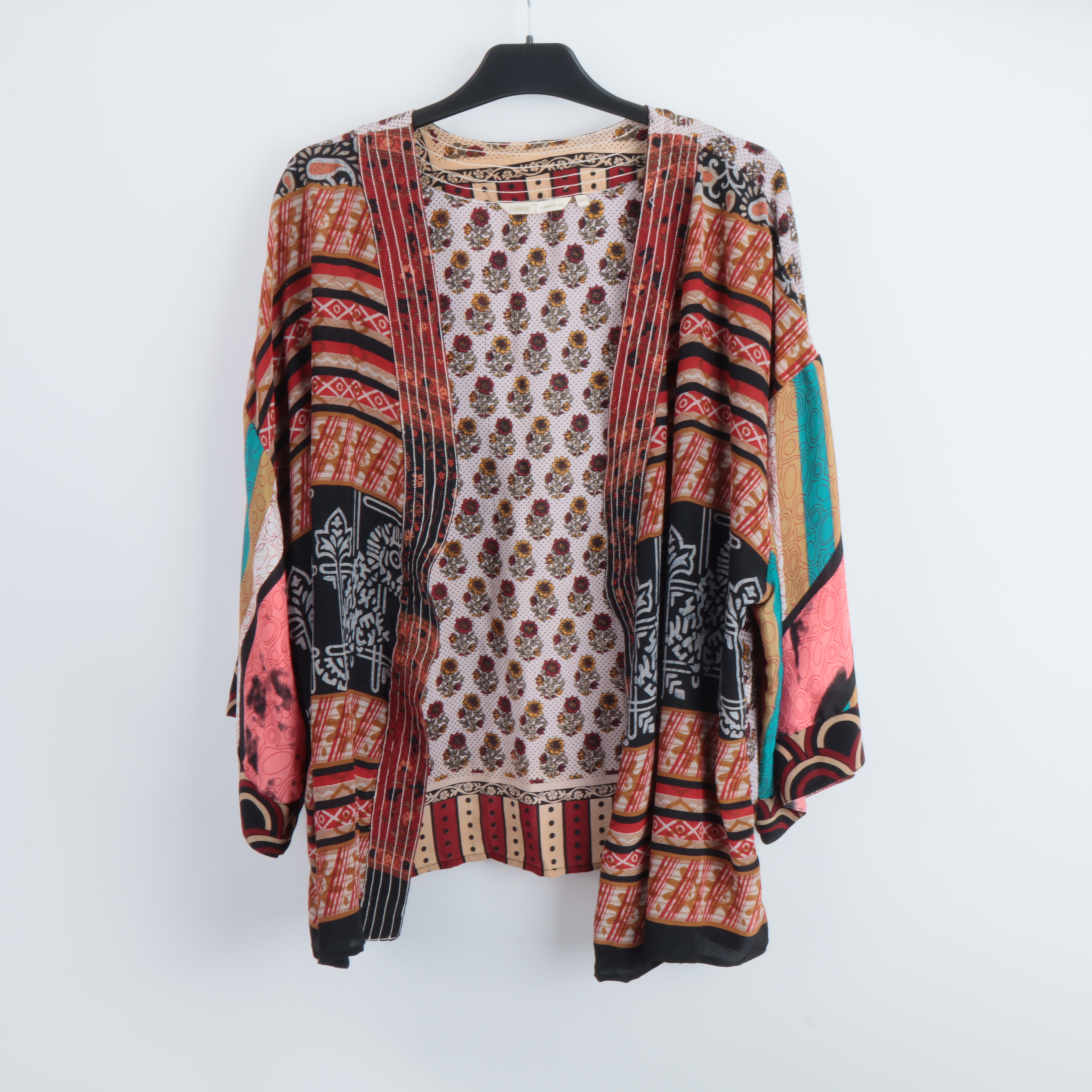Mönstrad kimono i livfulla färger, skapad av återvunnet saree-silke. Designen inkluderar blommönster och geometriska former, vilket ger en unik, etnisk stil. Perfekt för avslappnade tillfällen och ger en färgklick i garderoben.