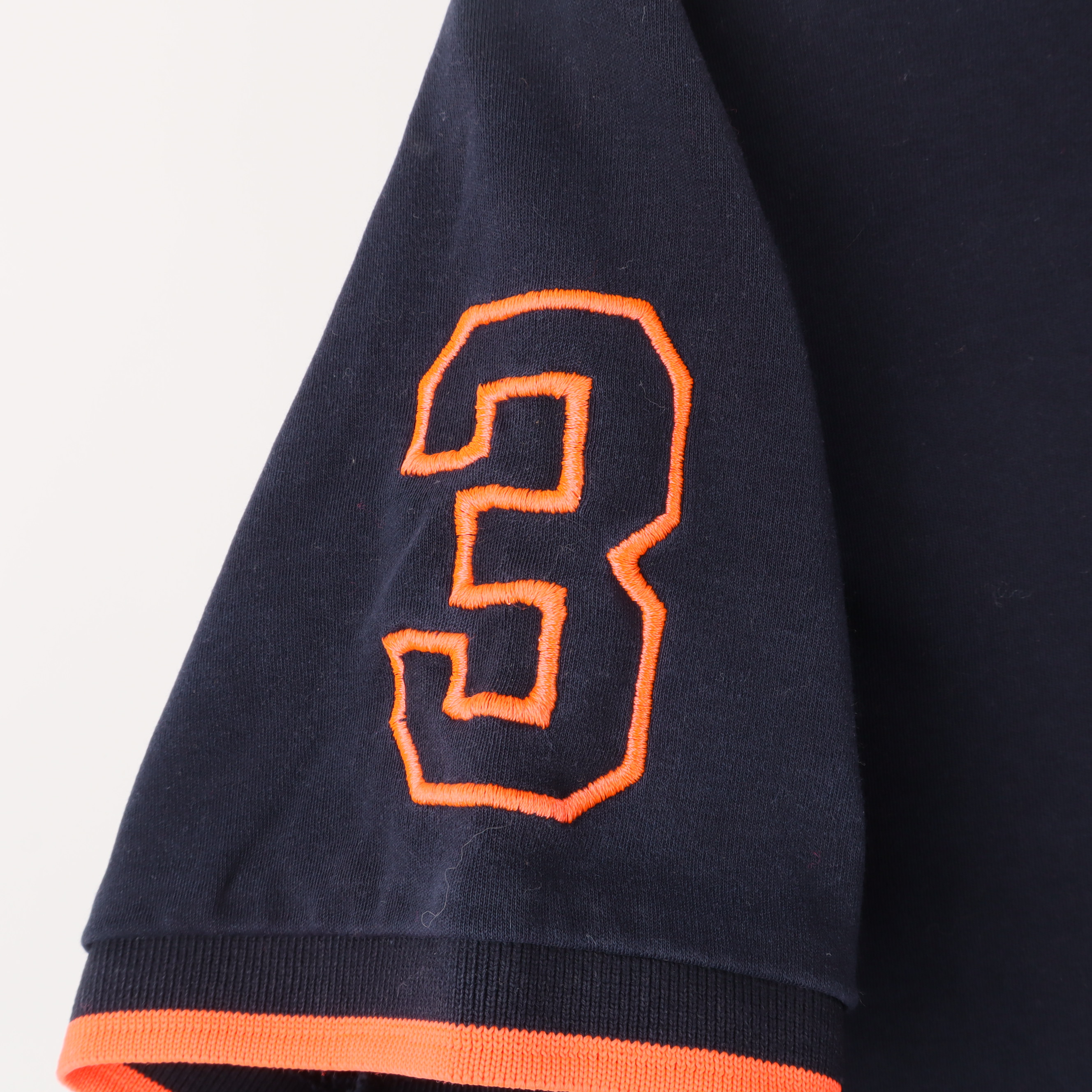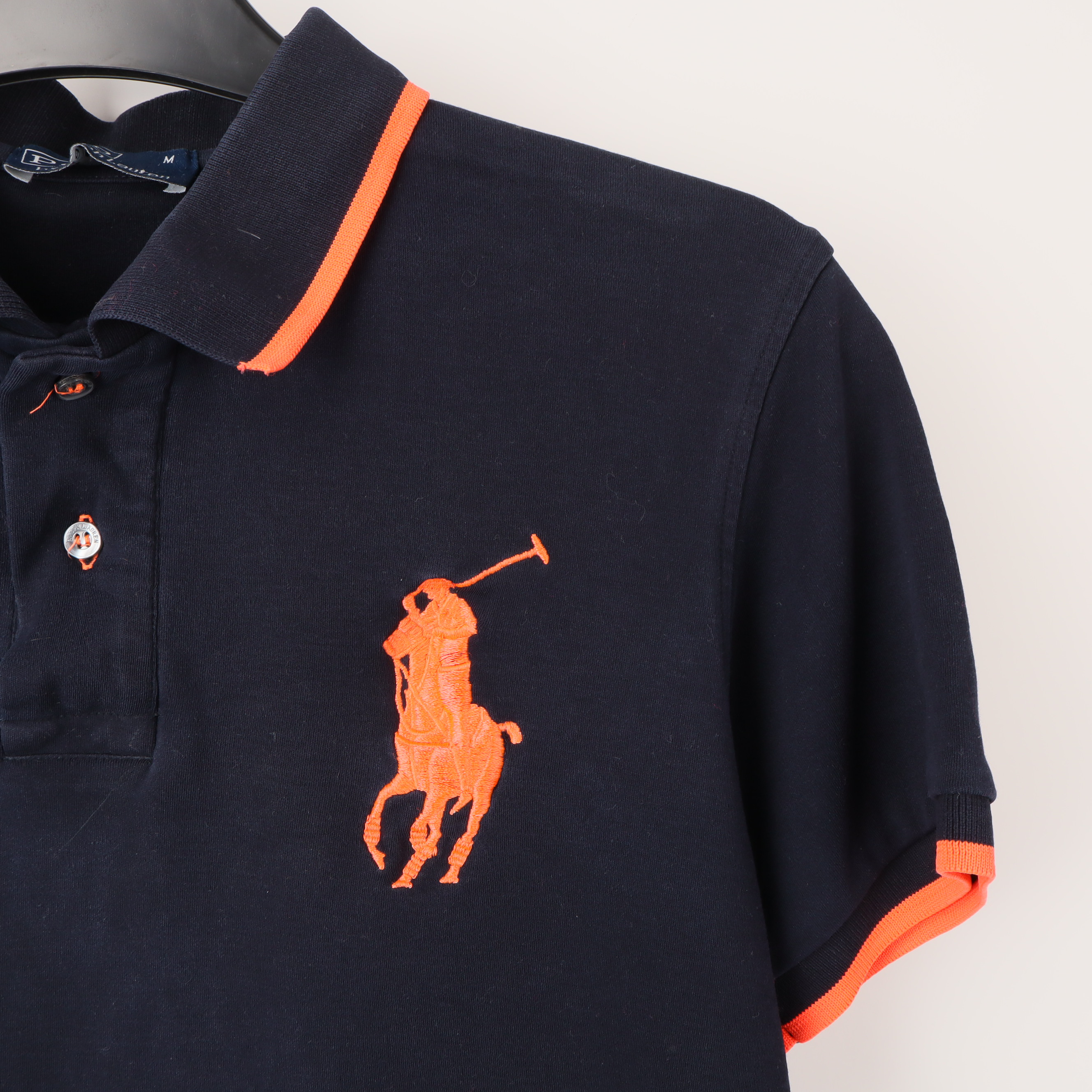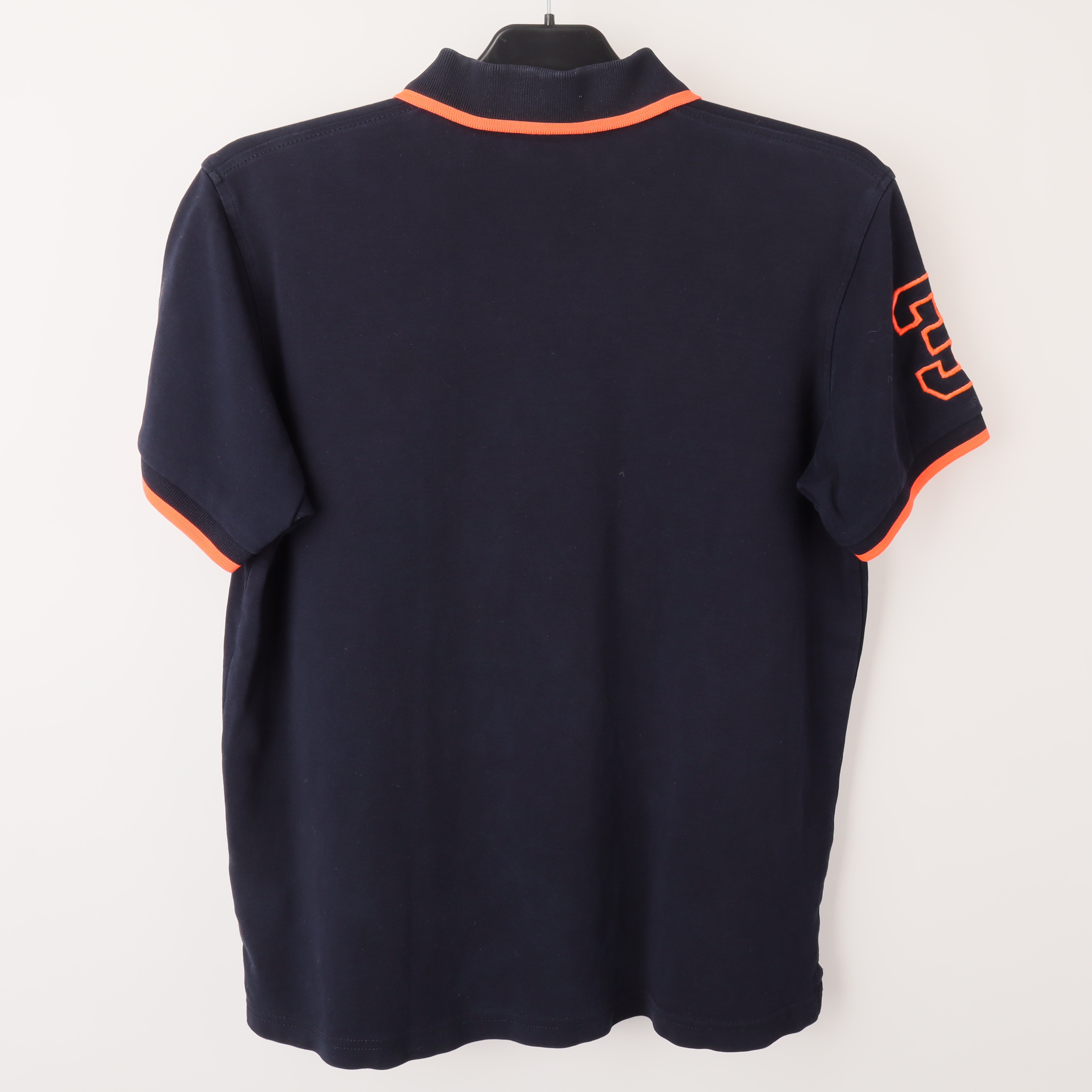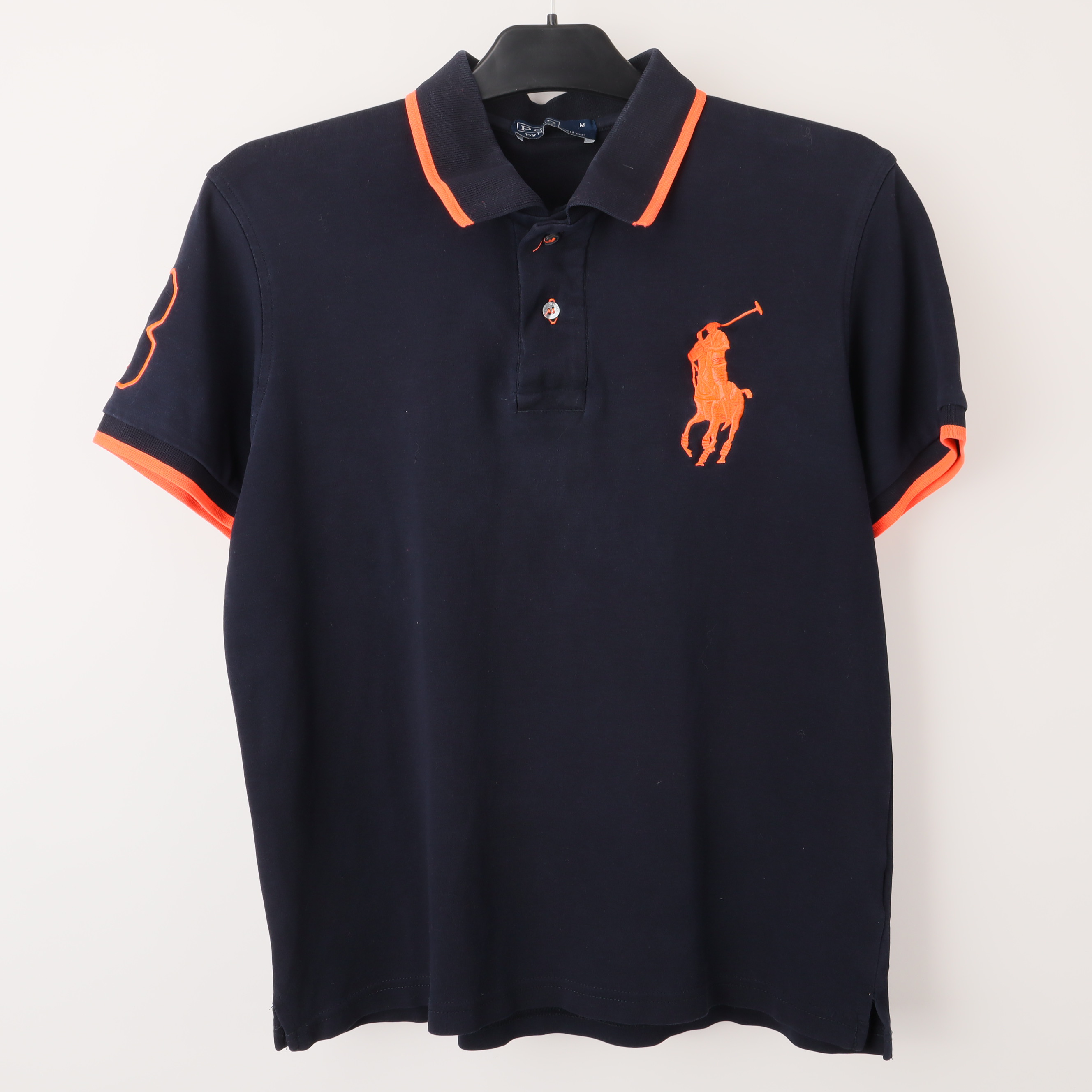 Denna mörkblå pikétröja från Polo by Ralph Lauren är tillverkad av 100% bomull, vilket ger en mjuk och bekväm känsla. Den har en klassisk krage med knappar i kontrasterande färger och en distinkt orange broderad logotyp på bröstet. Med sina korta ärmar och ribbade muddar är denna tröja perfekt för både vardag och mer avslappnade tillfällen. De orange detaljerna på krage och ärmar ger en attraktiv kontrast till det mörkblå tyget. Tröjan har ett nummer tre broderat på ena ärmen, vilket ger ett sportigt utseende. Den är mångsidig och kan bäras tillsammans med jeans eller chinos för en stilren look. Pikétröjan är också försedd med ett diskret märke på insidan, vilket förstärker dess autentiska design. Skötselråd finns på den invändiga etiketten, och den är lätt att underhålla.